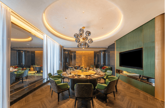 6楼“闽都悦滟”包厢以“八山一水一分田”的福州独特地貌为灵感,将福州山水自然之美,与金鱼的灵动之韵相融合。餐厅名称寓意“滟滟流云、金玉满堂”,将尊贵之感融入每一处细节。餐厅共设11间包厢,最大“闽都厅”达120平方米,可容纳30人同席用餐。