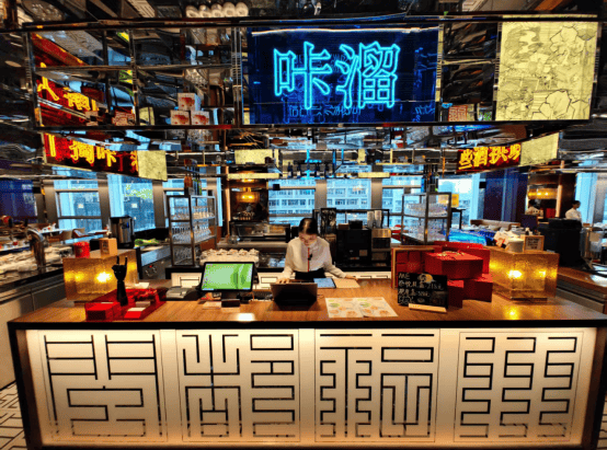 地面铺着刻有“福州、闽都、榕城”九叠篆字体的地砖,“繁花似锦”图案融汇油纸伞、茉莉、荔枝等福州元素。闽剧脸谱通过马赛克工艺在地面绽放,传统艺术与现代设计完美碰撞。霓虹方言装置点缀空间,用光影诉说地道的福州故事。180个餐位错落有致,以当代烹饪艺术重新诠释经典粤式茶点、创意锅物与精致闽飨。