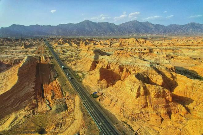 每当夜幕降临,川流不息的车辆开着车灯行驶其间,独库公路仿佛一条逶迤的金色巨龙,盘绕在天山山麓,雄踞在西北边陲。
