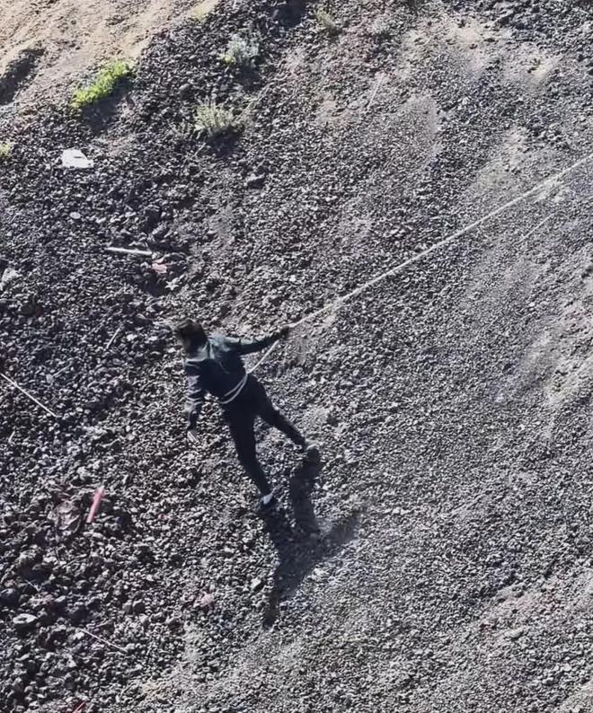 内蒙古乌兰察布的火山,拍完宇航员照片的游客,将废弃冷焰火随地乱扔,只能让工作人员再吊着绳子下去一个个地捡在一起;