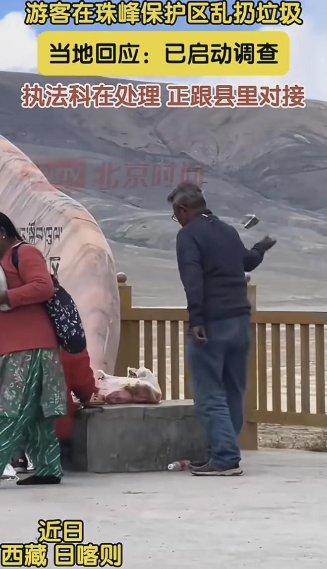 西藏日喀则珠穆朗玛峰自然保护区,旁边的牌子上写着禁止乱扔垃圾,还有人在此野餐,随手扔西瓜皮;