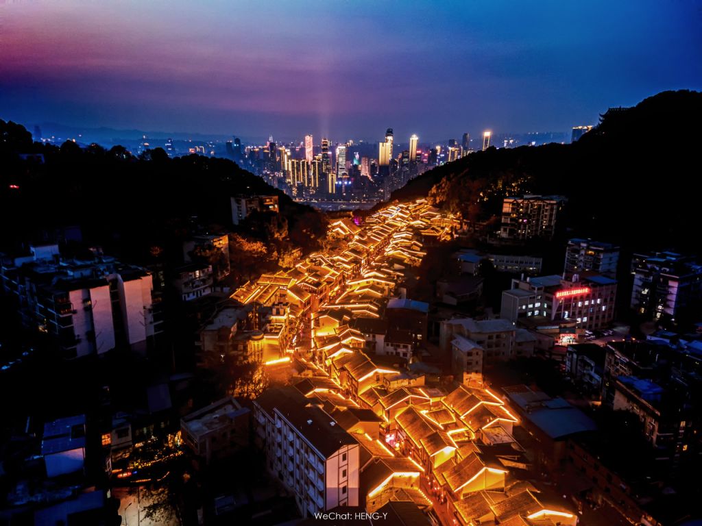 千年老街与现代光影碰撞,沉浸式夜景体验!12级阶梯式老街灯光璀璨,可以去长嘉汇观景台观看江北嘴、渝中半岛双子塔夜景。
