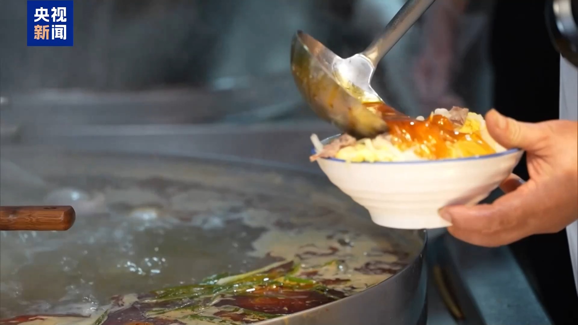 同样不能错过的还有安徽的“早餐顶流”淮南牛肉汤。清晨的街头,大锅翻滚着奶白色的汤底,牛骨与数十种香料熬出醇厚滋味,再加入粉丝、千张、豆饼,撒上香菜和胡椒粉。喝一口,鲜香扑面而来。